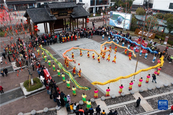 2月14日在寿昌镇拍摄的五龙闹元宵表演(无人机照片)。