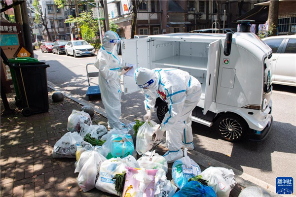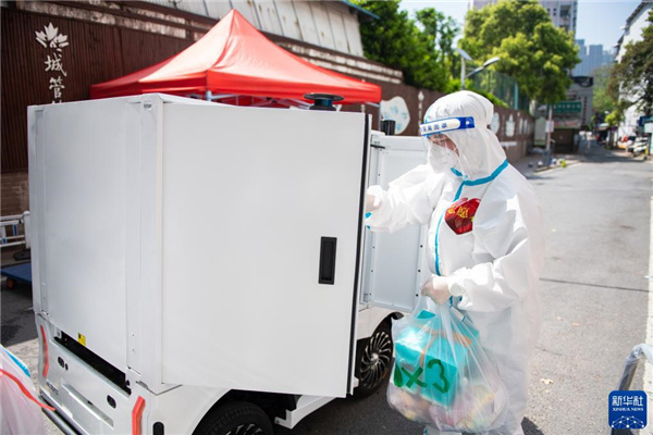 4月7日,在长沙市雨花区东塘街道枫树山社区,志愿者把无人车内的生活物资卸载到集中卸货点。