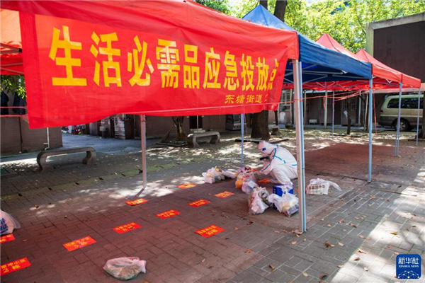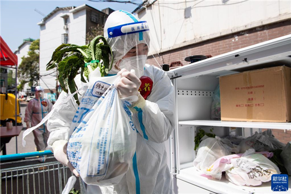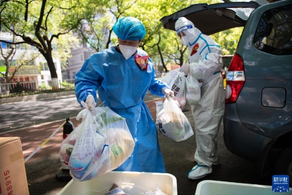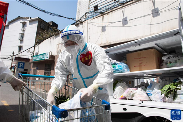 4月7日,在长沙市雨花区东塘街道枫树山社区,志愿者在卸载生活物资。