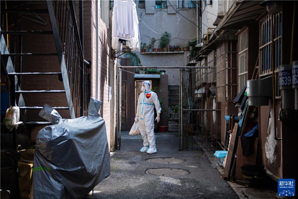 4月7日,在长沙市雨花区东塘街道枫树山社区马家冲小区,志愿者上门为居家隔离的居民配送物资。
