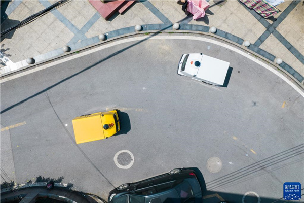 4月7日,在长沙市雨花区东塘街道枫树山社区,两辆运送物资的无人车在工作中(无人机照片)。