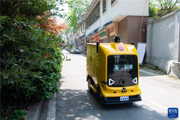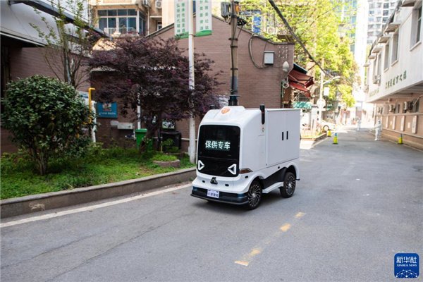 4月7日,在长沙市雨花区东塘街道枫树山社区,一辆无人车在运输生活物资。