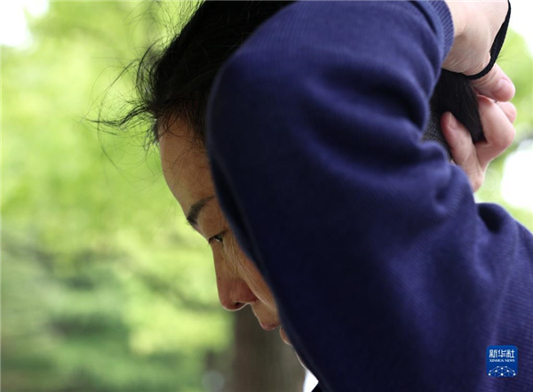 4月28日,王瑛在结束一段工作后,准备更换新口罩。