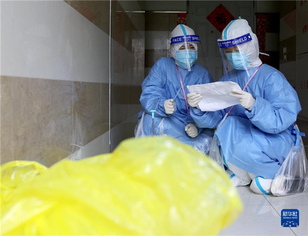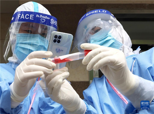 4月28日,王瑛(左)和小陈完成核酸采样后进行核对工作。