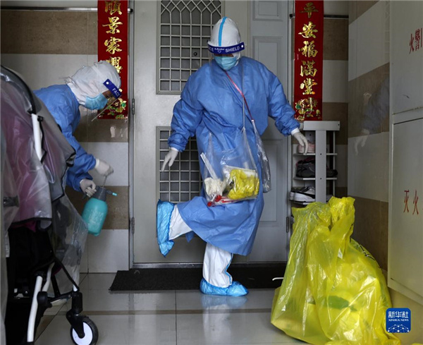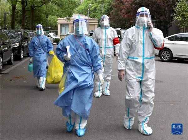 4月28日,王瑛(前左)和街道居委会书记(前右)前往将要复核采样的居民楼。