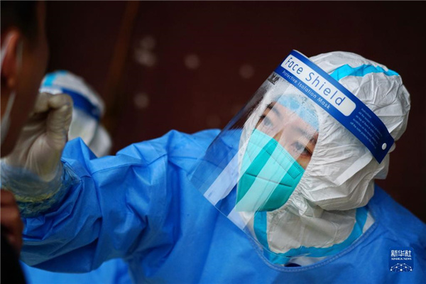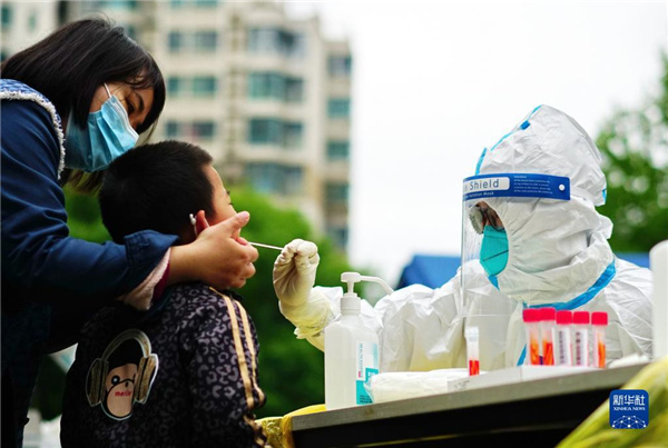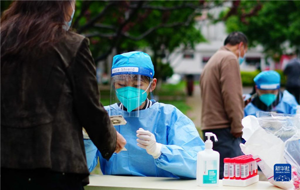4月28日,医务人员在北京丰台区青塔街道核酸检测点为居民采样。