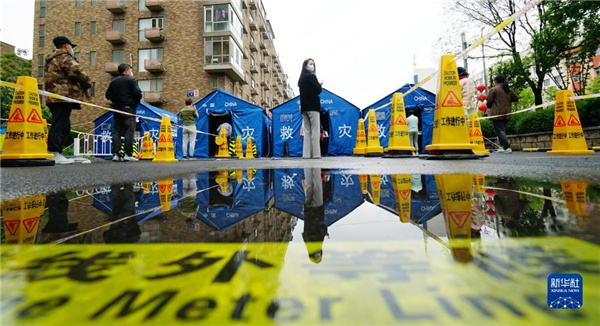4月28日,居民在北京丰台区青塔街道的核酸检测点参加核酸检测。