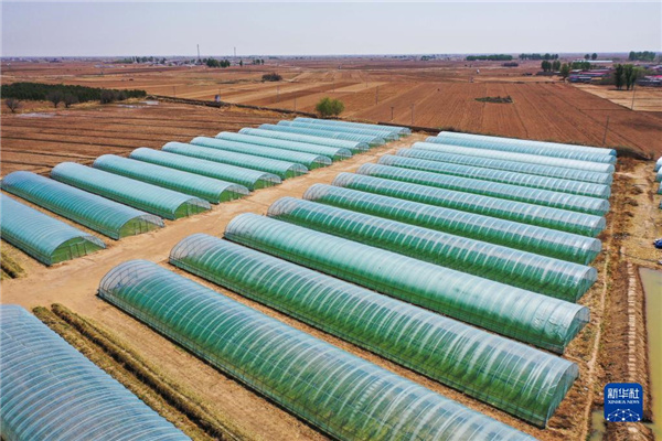 这是4月28日在达拉特旗树林召镇田家营子村拍摄的水稻育秧大棚(无人机照片)。