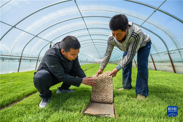 4月28日,在达拉特旗树林召镇田家营子村,工作人员在查看水稻秧苗。