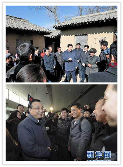 一则是习近平总书记来到自古就有“瘠苦甲天下”之称的甘肃省定西市考察百姓期盼半个多世纪的圆梦工程——引江供水工程工地;并与谓源县一个农村的村民们共商脱贫之计;另一则是李克强副总理在包头车站候车室看望返乡农民工,与农民工交谈(见新华网2013年2月3日)。两则消息都传出了中共新一届领导层向公众拜年之意,然而,拜年的方式却不同。