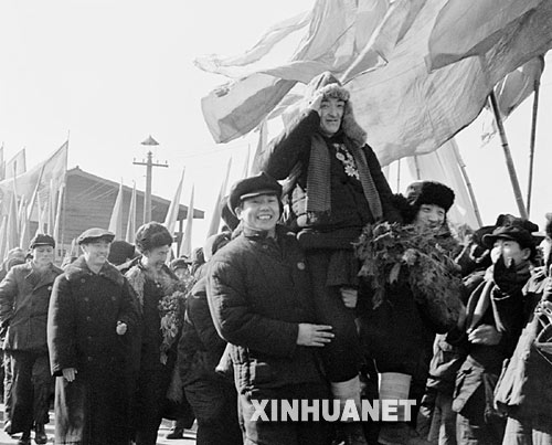 1954年,东北各地的工人和农民们在春节期间展开盛大的工农联欢活动。图为当东北各省农业劳动模范参观团到达辽宁省鞍山市时,受到工人们的热烈欢迎。新华社发