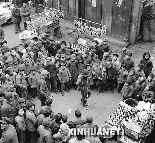 1957年春节期间的上海街头。扯铃摊上发出一片嗡嗡声,吸引了不少小顾客。 新华社发