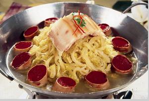 白肉血肠选料考究、制作精细、调料味美;白肉肥而不腻、肉烂醇香、血肠明亮、鲜美细嫩;配以韭菜花、腐乳、辣椒油、蒜泥等佐料,更加醇香四溢,鲜嫩爽口。成为辽宁和吉林省满族特有的传统名菜。