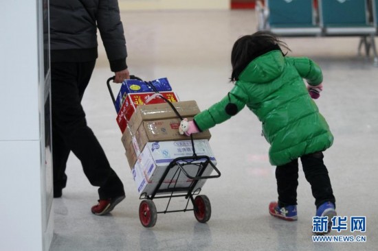 春运期间,踏上归途的一些孩子在旅途上帮助家人拿行李、照看行囊,他们稚嫩的身影成为一幅幅特别的春运图画。新华社发(许丛军摄)