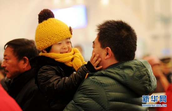 1月26日,在石家庄新客站候车大厅,一位小朋友和父亲一起候车。当日是全国春运的第一天,许多孩子跟随家长加入“春运大军”,踏上回家路。新华社发(朱旭东摄)