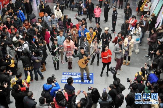 2月3日,20多位“闪客”在杭州火车站用歌舞的形式为旅客表达祝福,吸引大批旅客驻足围观。当日下午3点10分,一场名为“温暖回家路”快闪活动在杭州火车站上演,由杭州歌剧舞剧院20多位舞蹈演员扮演的“闪客”突然同时从人群中“脱颖而出”,或歌或舞,并向春运中匆匆赶路的旅客赠送玫瑰或祝福卡片,成为一道亮丽的风景线。新华社记者黄宗治 摄