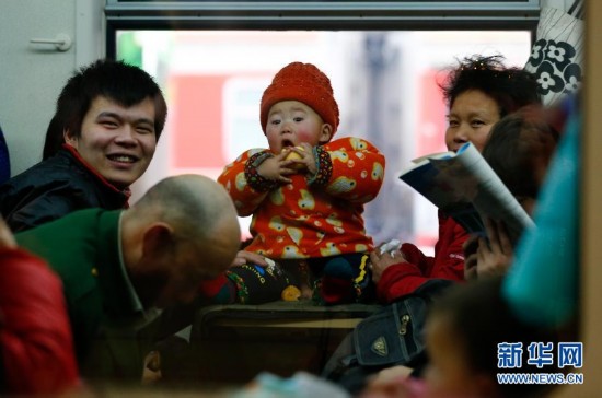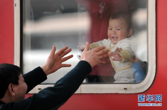 1月26日,在杭州火车站,乘坐宁波东开往广州列车的阳先生在停车间隙从窗外与自己的小孙子透过车窗互动。当日,2013年的春运正式启动,在预计34.07亿人次的旅客流量中,还有不少孩子的身影。他们有的还在襁褓当中,背在父母身上,倚在亲人身边;有的则已经开始拎着书包,背着背包,跟着父母一起奔波在回家的路上。春运里的孩子成了一道独特的风景。新华社记者鞠焕宗 摄