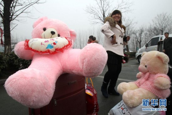 2月1日,江苏省如皋市一家娱乐用品公司的员工张艳带着毛绒玩具熊在河南商丘下车。