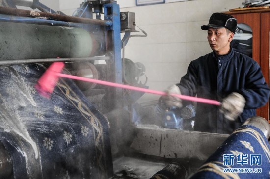 贵阳客运段整备中心的洗涤车间内,一名工人在清洗换下的地毯(1月29日摄)。