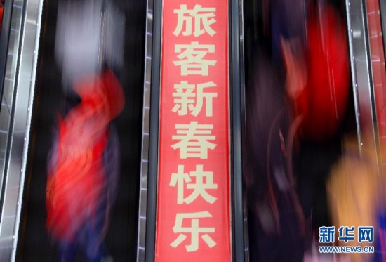 1月26日,在杭州火车站通往候车大厅的自动扶梯上,大量旅客从扶梯间张贴的“旅客新春快乐”的标语旁经过。当日,为期40天的2013年春运正式启动。春运期间,全国旅客发送量预计将达到34.07亿人次。新华社发(吴煌 摄)