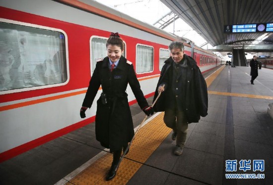 “素萍服务组”成员谢依将一名盲人旅客送上列车(1月25日摄)。