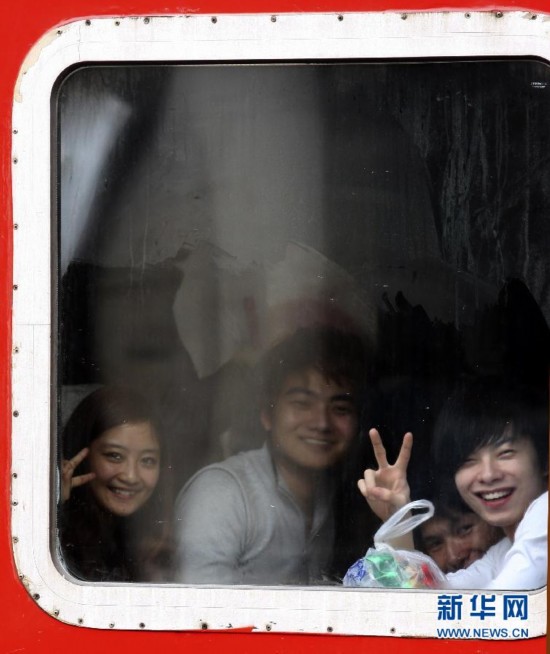 几名旅客在广州火车站的列车上对着窗外摆出“Yeah”的手势(1月31日摄)。