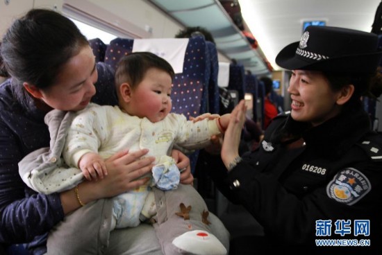 1月26日,北京乘警支队乘警郑维(右)在北京至汉口的1955次临客列车上与旅客交流。 当日是春运第一天,北京铁路警方开展“温暖回家路,平安伴您行”主题宣传活动,同时加强对春运安全的监督和管理。新华社发(李非飞摄)