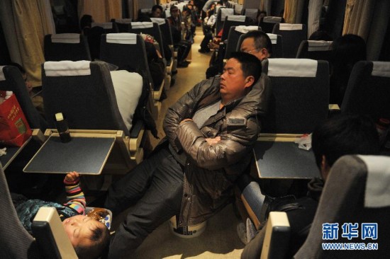 1月29日凌晨,旅客进入梦乡。春运旅途成了很多旅客回家团聚前必须经历的“煎熬”。记者近日登上浙江杭州开往安徽阜阳的L8600次春运列车,在凌晨时分记录下了归乡旅客疲惫的“睡姿”。新华社记者韩传号 摄