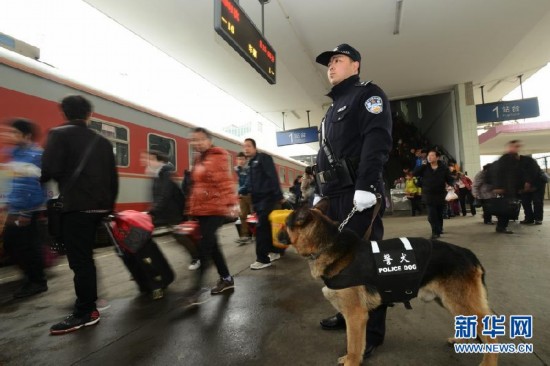 临近春节,湖北襄阳铁路公安处干警带领警犬在辖区的大客运站进行搜爆、防爆、缉毒巡视,确保春运期间旅客及运输生产的安全。新华社发(贺瑞明摄)