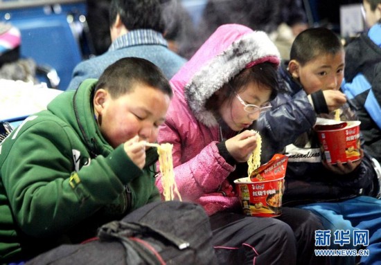 准备跟父母回家过年的几个孩子坐在山东省威海市火车站候车大厅吃泡面(2013年1月31日摄)。