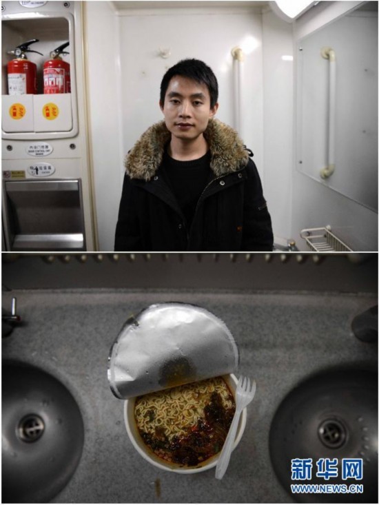 小周今年22岁,在北京进行毕业实习,他的晚饭是一碗泡面,价格是3.5元(2月1日摄)。在过年回家的途中,舌尖上的美味各不相同。记者在北京至井冈山的列车上看到,有的人吃着泡面,有的人吃着盒饭,大部分人吃着自带的干粮、水果和零食,虽然基本只限于饱腹,但因家在前方而显得特别可口。新华社记者周密 摄