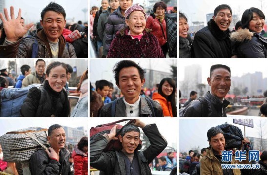 这张拼版照片显示的是1月26日上午,在重庆龙头寺长途汽车站,外出务工人员面带笑容,准备乘车返乡。当日是2013年春运第一天,为期40天的春运正式启动。新华社发(周会 摄)