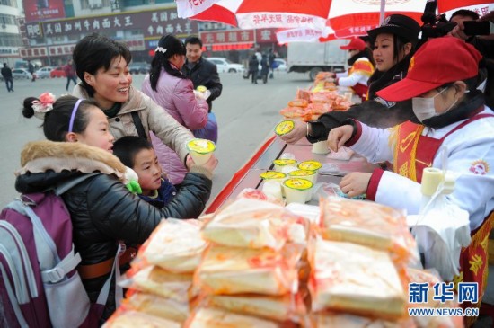 1月26日,春运志愿者为即将乘坐列车的旅客送上早餐。当日是2013年春运的第一天,合肥市瑶海区城管局请来春运志愿者在火车站广场设立“春运志愿便民服务站”,为在火车站乘车的旅客提供免费早餐。过往的旅客凭手中的火车票即可免费领到一个面包、一个热包子和一杯热豆浆。据了解,免费向旅客发放早餐的活动将一直持续到整个春运结束。新华社记者 杜宇 摄