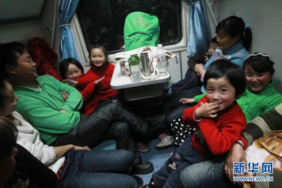 1月30日,杨晶晶(右前)和自己的家人挤坐在硬卧铺位上,他们从舟山回老家阜阳过年,顺利坐上车的兴奋让他们睡意全无。当日凌晨1时08分,记者登上L8562次列车,体验1600多名旅客的返乡之路。这辆发于上海、终至安徽阜阳的春运临客共有17节车厢,全程的超载量限定在30%,中途停靠苏州、无锡、镇江、南京等9个车站。尽管车厢拥挤、旅途劳顿,但每个人心中都装着团圆的心愿,回家是此刻最大的幸福。新华社记者裴鑫 摄