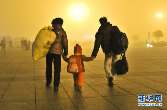 1月30日,一家三口在大雾中走出江苏徐州火车站。