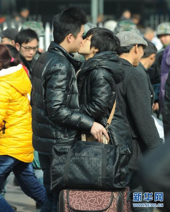 1月26日,一对情侣在成都火车站的站前广场上吻别。不知从何时起,乡愁变成了一张张小小的车票,牵动着满怀思念的归人。春运中,总有一些温暖的瞬间,触动我们柔软的内心:亲人关爱的眼神、情人分别的泪水、孩子天真的笑容……它们,让寒冷的冬季变得温暖,给艰辛的旅程注入了美好。当团聚的心愿深深扎根于心底,当沉重的行囊背负着似箭的归心,回家的路,似乎不再漫长。新华社发(薛玉斌摄)
