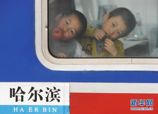 1月26日,两位小朋友在沈阳北站的列车上向外张望。不知从何时起,乡愁变成了一张张小小的车票,牵动着满怀思念的归人。春运中,总有一些温暖的瞬间,触动我们柔软的内心:亲人关爱的眼神、情人分别的泪水、孩子天真的笑容……它们,让寒冷的冬季变得温暖,给艰辛的旅程注入了美好。当团聚的心愿深深扎根于心底,当沉重的行囊背负着似箭的归心,回家的路,似乎不再漫长。新华社发