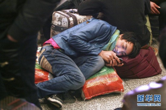 在江苏省南通市长途汽车站候车室内,一名旅客躺在行李上玩手机,消磨等车的时光(2013年2月1日摄)。一年一春运,除了大包小包带给家人的礼物外,行装里还有不少给力装备,让漫漫回家路变得轻松、舒心一点。新华社发(崔根元摄)