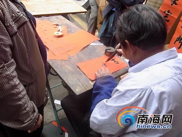 虽然这些春联“很漂亮”,可是在海口市老居民的心目中,春联还是“手写的好”。在海口市博爱南路的一处骑楼门前,今年62岁的陈先生已经在这里等了近两个小时,他在等“手写的春联”。给他写春联的是一位姓周的老先生,今年已经70多岁了,写了三十多年的春联,如今虽是古稀之年,可他依旧宝刀未老,潇洒地挥毫泼墨。