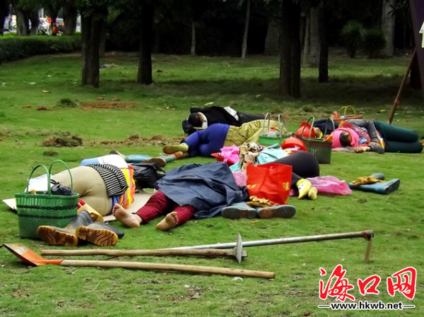 近几日园林工人辛勤劳作,累了就在草坪上躺着休息,草坪又湿又凉,很多市民看了都很心酸,望相关部门能够提供工人们休息场所,为他们的工作带来便利。