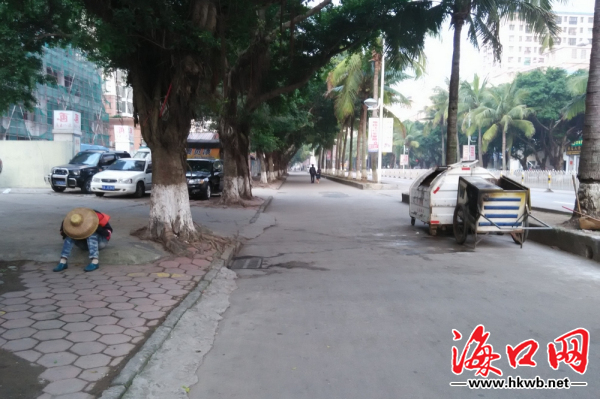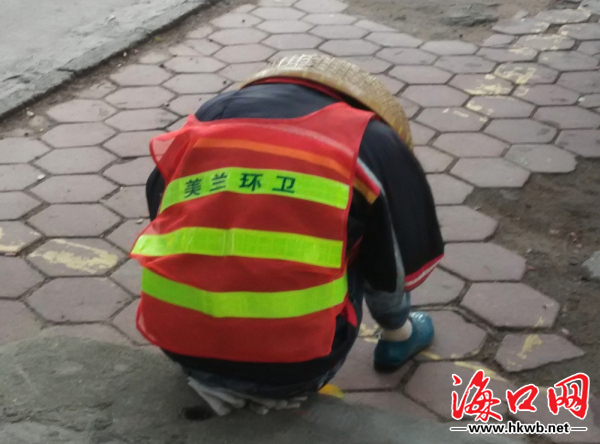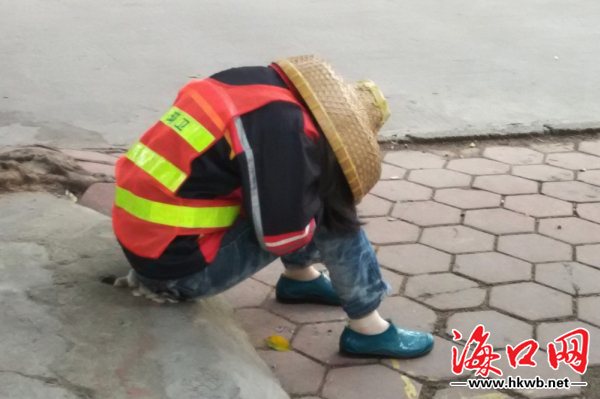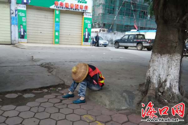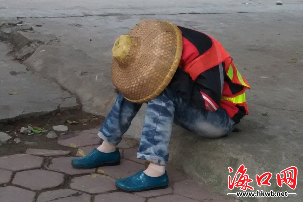 2月28日上午7时,在海口市文明东路武警医院对面,一位中年女环卫工把大街上的纸屑和垃圾打扫得干干净净,并装车拉到中转站转运完毕后,疲劳地坐睡在旁边的人行道上睡着了。身旁是川流不息的人群,嘈杂纷扰的环境,但她就一个人坐在地板上,静静地睡着了,由于这几天低温地板凉,她脱下手套铺在地板上坐着,头戴斗笠,双手搭在膝盖上埋头大睡。她睡得很香,周围的一切都不能打扰到她。我没有问她为什么换班了还睡在这里,因为我怕惊扰了她此刻的梦。她是海口美兰区一名环卫工人,每天起早贪黑的工作十分辛苦。笔者呼吁市民出行时要增强不乱丢垃圾文明意识,为广大环卫工人减负。