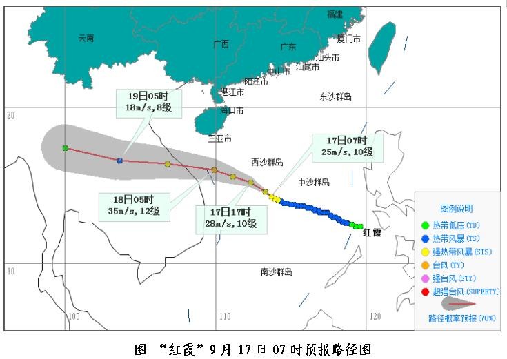 海南省气象台预计,“红霞”将以每小时20公里左右的速度向西偏北方向移动,17日从中沙群岛和西沙群岛以南海面经过,18日经海南岛以南海面趋向越南中部沿海,强度逐渐加强,最大强度可达台风级(12~13级,33~38m/s),并将于18日中午前后在越南中部沿海地区登陆,尔后强度逐渐减弱。