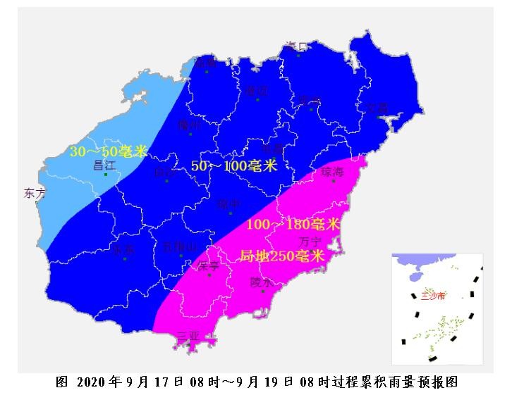 预计9月17日8时~19日8时各地过程雨量:陵水、三亚、保亭、琼海、万宁等市县100~180毫米、局地250毫米;文昌、琼中、白沙、屯昌、定安、澄迈、海口、临高、五指山、乐东和儋州等市县50~100毫米;昌江、东方等市县30~50毫米。