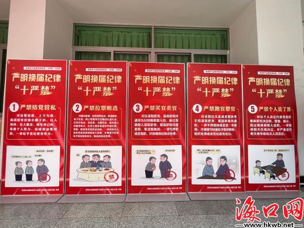 【严明“十严禁”纪律,确保大会风清气正】秀英区政协一届一次会议将于7日下午开幕。会场外设置了“换届纪律十严禁”的海报展板,严明“十严禁”纪律,确保大会风清气正。“十严禁”具体为: 1、严禁结党营私。2、严禁拉票贿选。3、严禁买官卖官。4、严禁跑官要官。5、严禁个人说了算。6、严禁说情打招呼。7、严禁违规用人。8、严禁跑风漏气。9、严禁弄虚作假。10、严禁干扰换届。(记者伍凤妹)