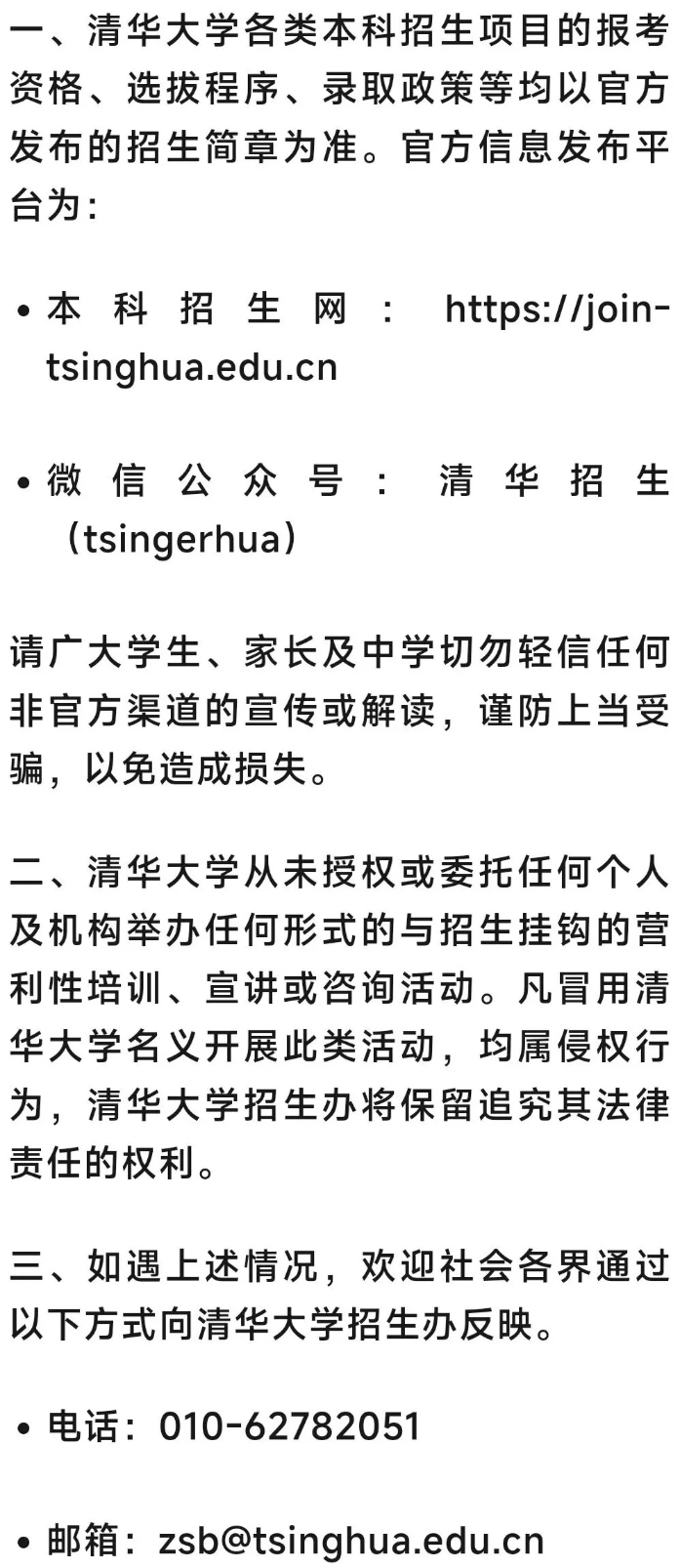 近日,清华大学招生办接到多所中学、家长及学生反映,有部分机构与个人冒用清华大学名义开展招生宣讲,散布不实招生政策,造成不良社会影响。为此,12月24日,清华大学招生办公室就本科招生相关工作发布如下郑重声明: