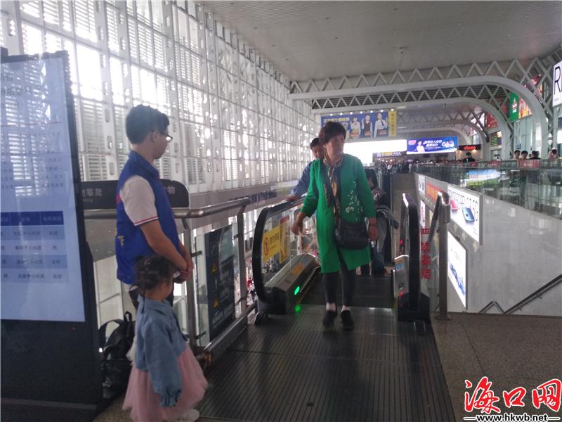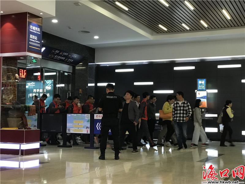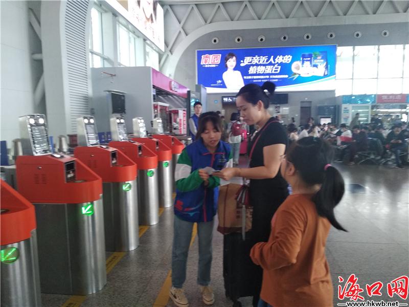 【春运有他们,很贴心!】“慢点,不着急。”“您好,请过一下安检。”“您想去的这个地方还有这些时间点可以选……”春运首日,在海口火车站,工作人员正在全力为旅客服务。(记者卢海浪)