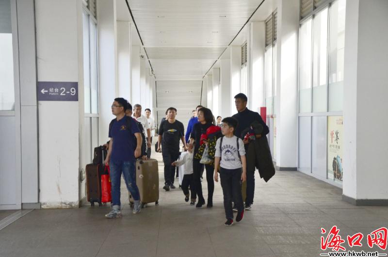 【赶车,回家!】10日14时许,海口火车站月台上,旅客在发车前的几分钟匆匆赶来,终于在开车前到达,成功登上回家的列车。(记者卢海浪)