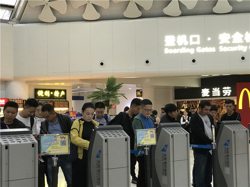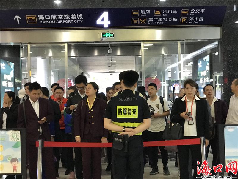 【层层安保 回家路更安全】10日9时许,海口美兰国际机场航站楼内熙熙攘攘,返乡大军在机场各出入口排起了队伍。机场公安等安保力量为机场和返乡人员提供安全保障,航站楼内各个出入口都有安保人员进行防爆检测工作。(记者吴安宜)