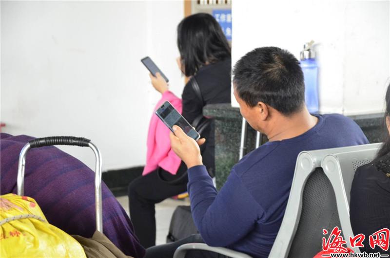 【回家,幸福的等候!】10日中午,在海口火车站候车厅内坐满了返乡的旅客。玩手机、睡午觉、吃泡面……他们用各自的方法打发着等候列车的时间。(记者卢海浪)