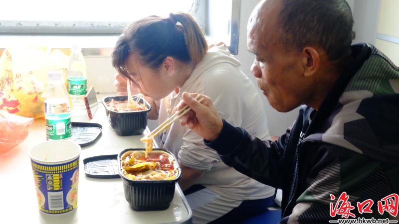 【香气满船舱 方便面、速食火锅受旅客欢迎】10日,在海口南港的最新一班跨海渡轮上,旅客纷纷拿出准备好的食物大快朵颐。其中,方便面是最受欢迎的食物,有的人还吃上了时下流行的速食火锅,船舱处处都是食物的香气。(记者陈亮嘉)